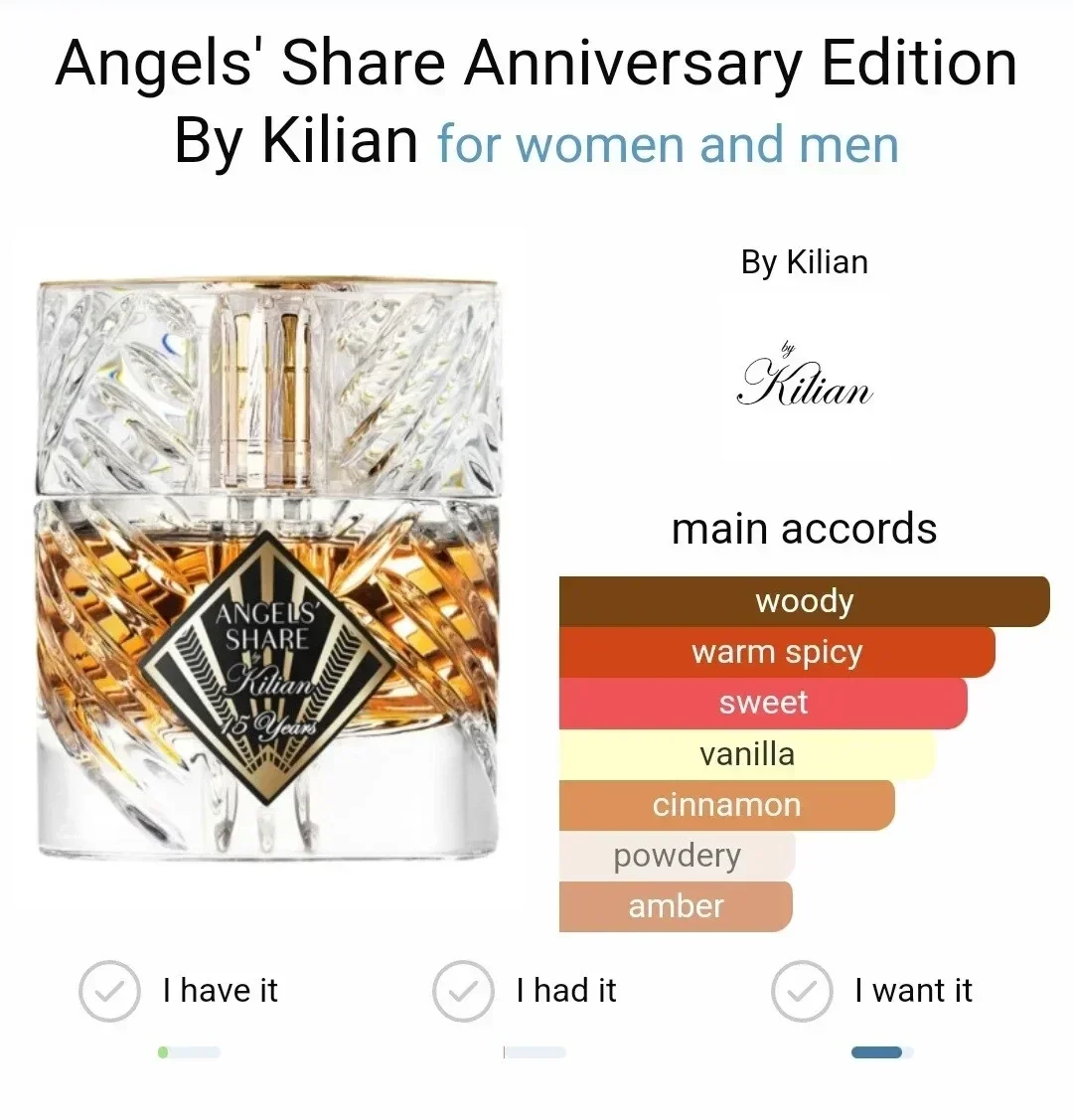 Angel's Share enthält die Essenz von Cognac, die dem Duft seine natürliche Karamellfarbe verleiht. Die langanhaltenden Noten von Sandelholz und Vanille sorgen für einen köstlichen Ausklang. In der Kopfnote eröffnet Cognacöl, abgerundet wird der Duft durch eine Komposition aus Eiche, Zimt und Tonkabohne. Angel's Share ist so einzigartig wie jeder Engel.