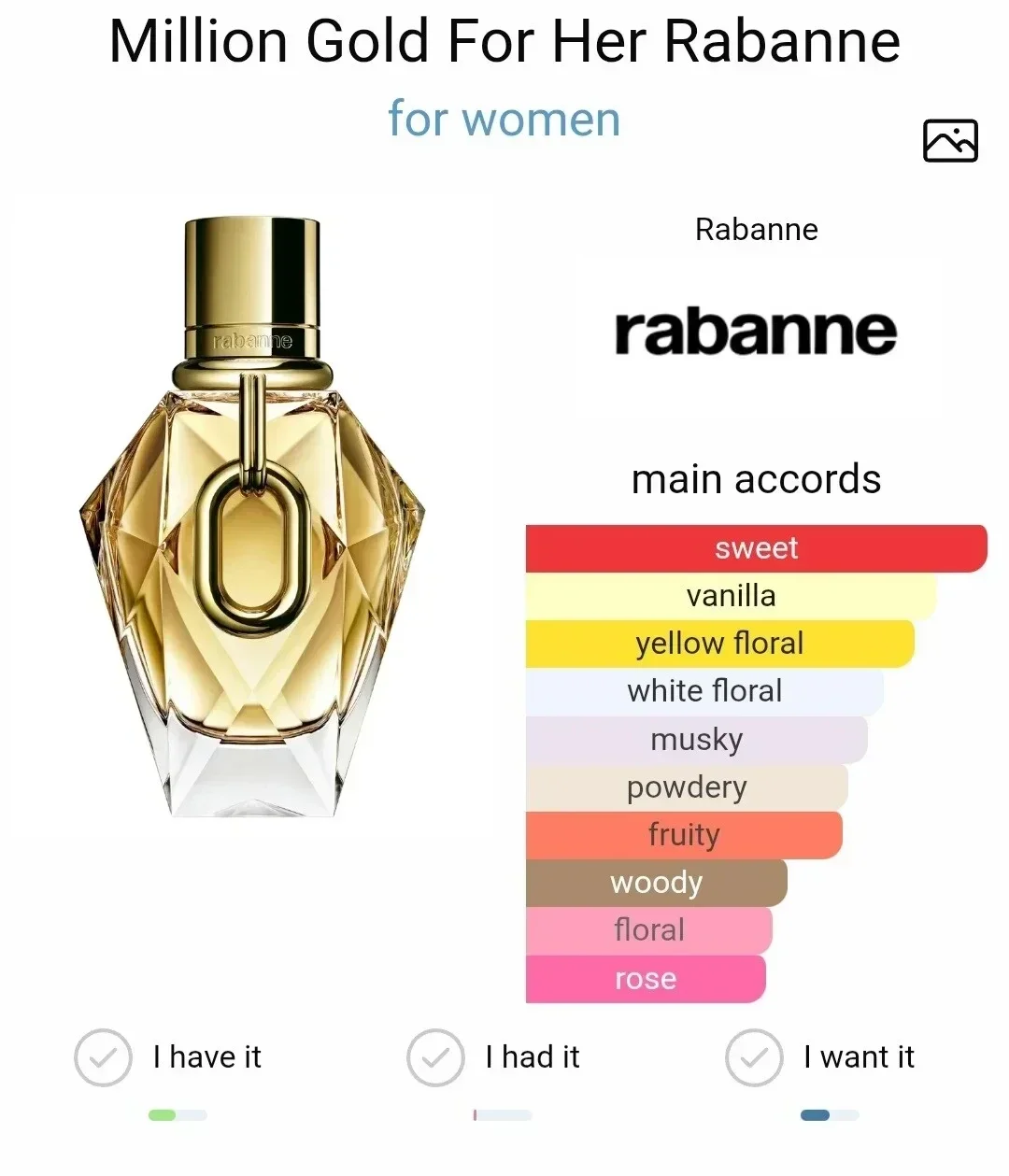 Erleben Sie das Gefühl des Erfolges, das Sie sofort in seinen Bann zieht. Das Eau de Parfum für Damen Rabanne Million Gold For Her strahlt eine ekstatische, schimmernde Energie aus, die Sie in einen absoluten Goldrausch versetzen wird. Es fesselt die Sinne mit einem berauschend sinnlichen Elixier aus flüssigem Gold, in dem funkelnde Rose, leidenschaftliche und wild-feminine weiße Blüten und süchtig machender mineralischer Moschus schimmern. Erleben Sie die berauschende Ekstase der ungezügelten Weiblichkeit in einem Eau de Parfum, das so gut aussieht und duftet, dass es eine Milliarde wert sein muss.