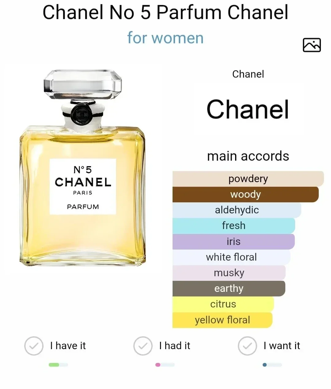 Zuerst nehmen Sie Aldehyde, Ylang-Ylang, Neroli und Zitrusnoten wahr. Darauf folgen die sanften Noten von Rose, Maiglöckchen und Jasmin. Die gesamte Komposition ruht auf einer Basis aus Amber, süßer Vanille und warmem Sandelholz mit orientalischen Patschuli-Noten.