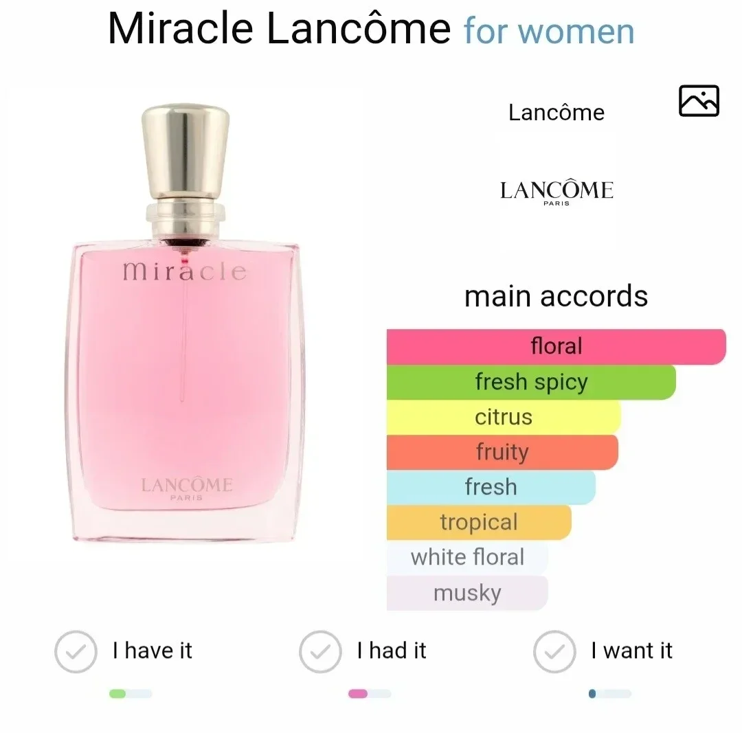 Lancôme Miracle wurde 2000 auf den Markt gebracht. Das hellrosa Design symbolisiert die Morgendämmerung, die Energie des neuen Tages sowie den vielversprechenden Anfang eines neuen erfolgreichen Vorhabens. Der pure und moderne Stil des Flakons verweist auf die 1930er Jahre, als der berühmte französische Glasbläser Lalique exklusiv ein Flakon für die Marke Lancôme kreierte.