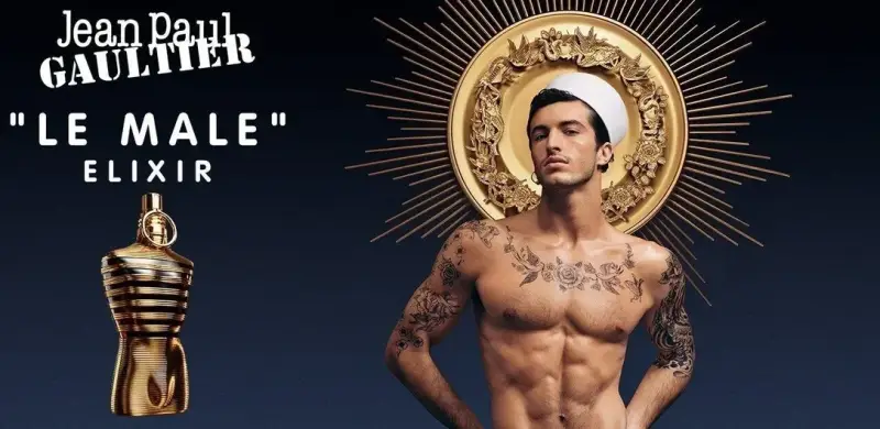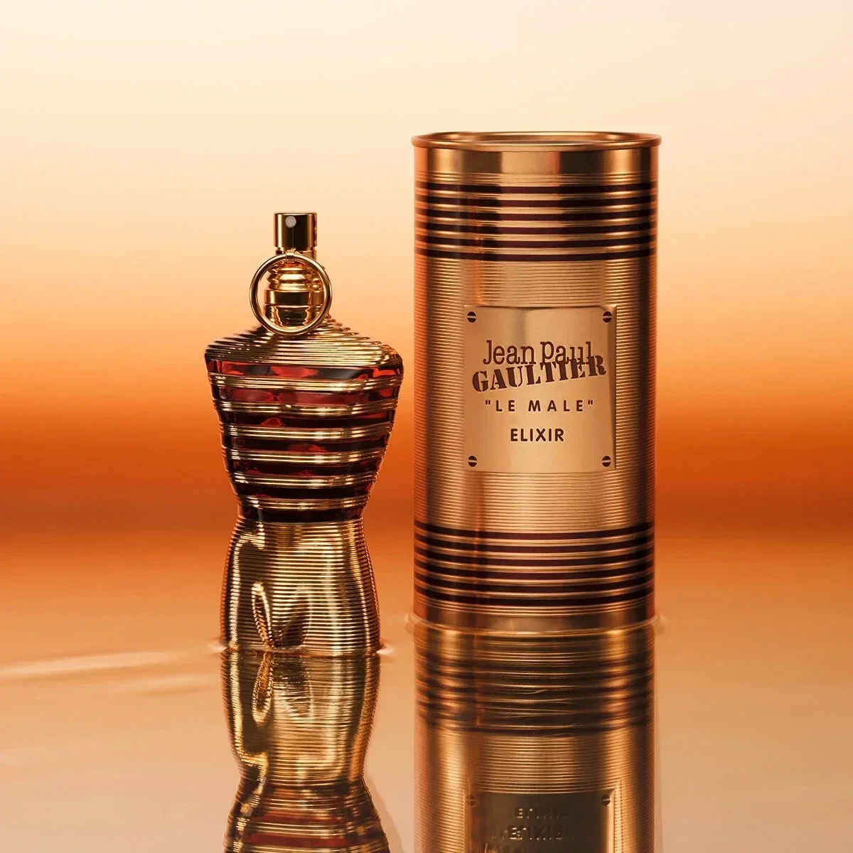 Willkommen an Bord! Der Herrenduft Le Male Elixir ist der Inbegriff des unwiderstehlichen Matrosen, der alles um sich herum erglühen lässt. Diese Geschichte verdeutlicht der unverwechselbare Flakon in Form eines männlichen Torsos, der mit stilvollen goldenen Streifen verziert ist, die an ein Matrosenoberteil erinnern.