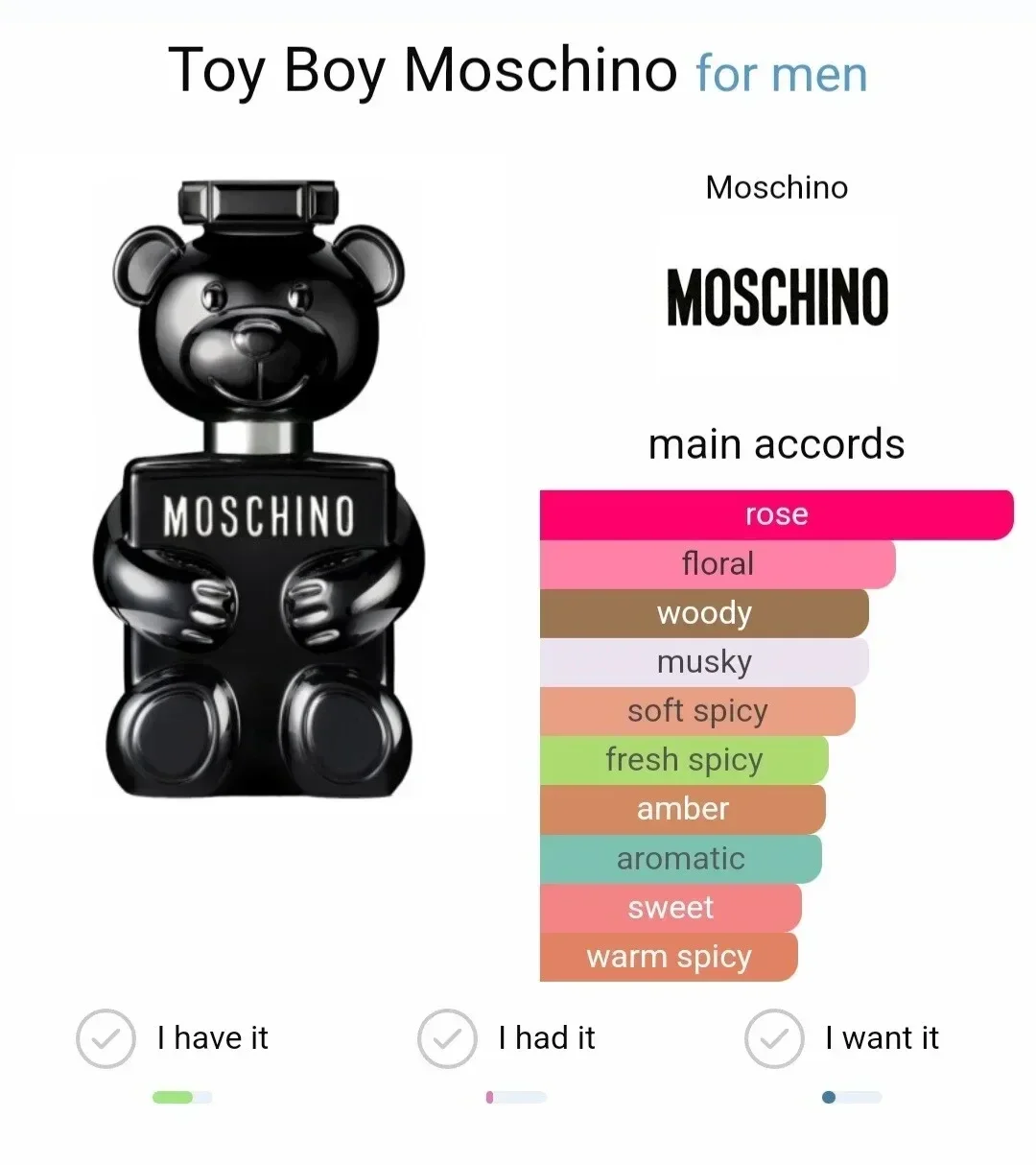 Toy Boy ist der erste Herrenduft, den der Creative Director und Designer Jeremy Scott für Moschino entworfen hat. Das Flakon hat erneut die Gestalt des legendären Moschino Bären angenommen, aber dieses Mal in einem undurchsichtigen schwarzen Lack. Gesicht der Marketingkampagne ist das brasilianische Model Jhona Burjack.