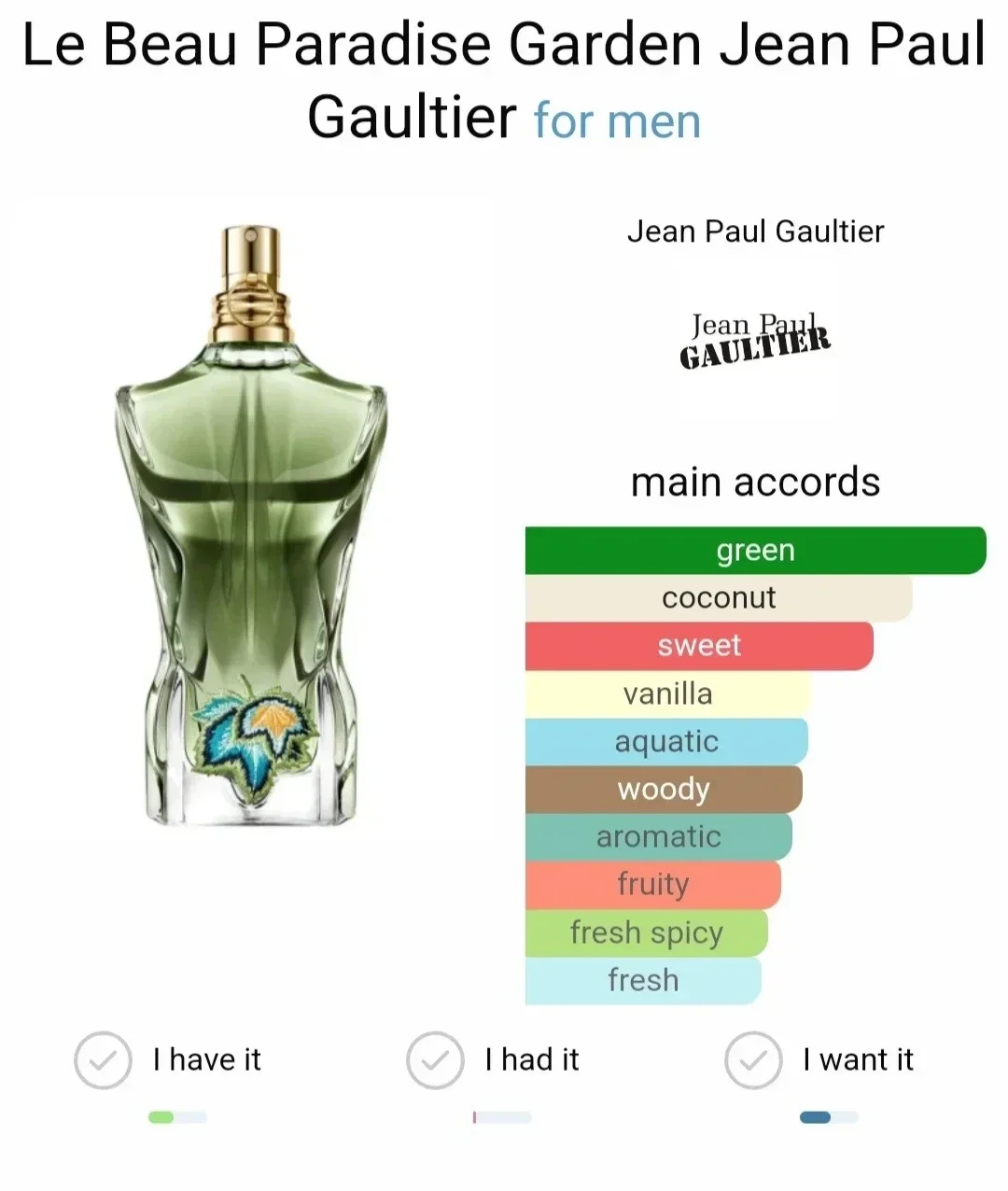 Der Duft Jean Paul Gaultier Le Beau Paradise Garden stellt mit dem Eau de Parfum Jean Paul Gaultier La Belle Paradise Garden ein perfektes Duo dar. Inspiriert durch die Herbst/Winter 2010-2011 Modeschau von Jean Paul Gaultier.