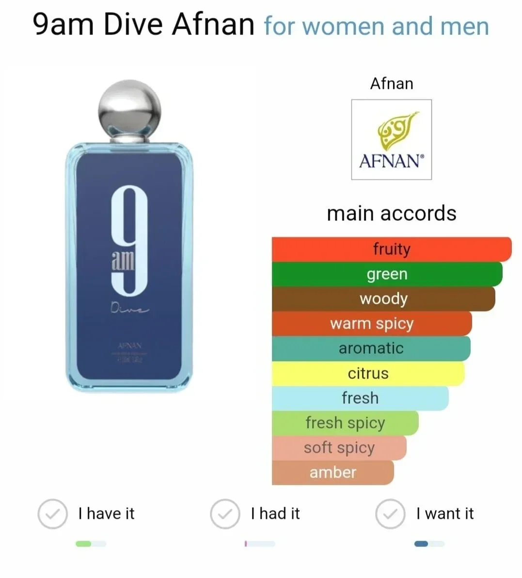 Der Duft 9 AM Dive begrüßt Sie im Auftakt mit strahlenden Noten von Zitrone, rosa Pfeffer, aromatischer Minze und schwarzer Johannisbeere, die an die ersten Sonnenstrahlen des Morgens erinnern. Dazu kommen das saftige Aroma von Äpfeln und das geheimnisvolle Zusammenspiel von Weihrauch und Zeder. Das große Finale besteht aus einer Kombination von erdigem Patschuli, zartem Jasmin, scharfem Ingwer und cremigem Sandelholz.