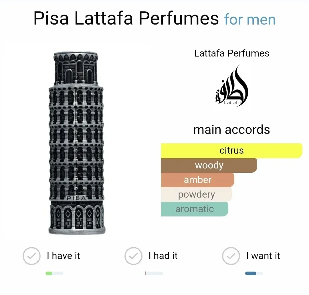 Sind Sie auf der Suche nach einem außergewöhnlichen Parfum für Ihre Duftsammlung? Das Lattafa Pisa Eau de Parfum für Herren wird Sie nicht nur mit seiner leichten zitrisch-holzigen Komposition begeistern, sondern auch mit seinem einzigartigen Flakon, der vom berühmten schiefen Turm von Pisa inspiriert ist. Einmal riechen reich, und Sie befinden sich im Herzen des sonnigen Italiens mit einem erfrischenden Drink in der Hand.