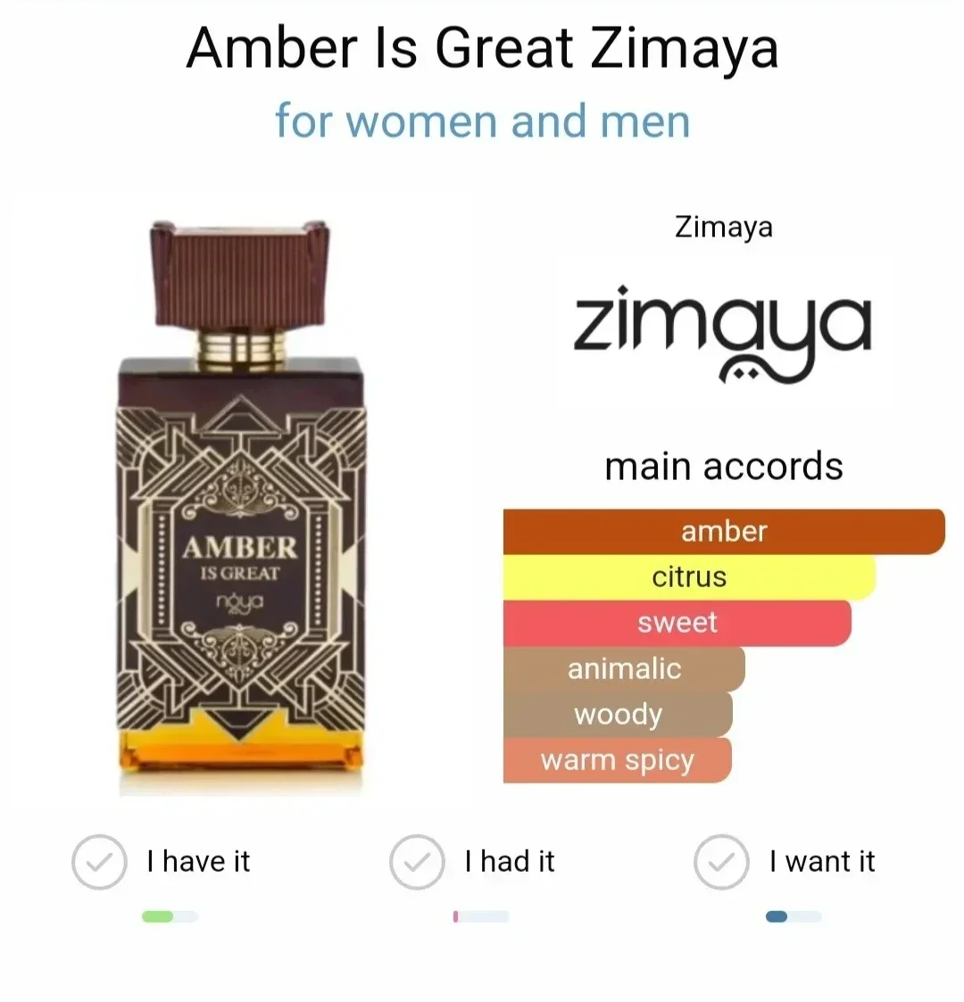 Entdecken Sie einen Duft, der in keine Schublade passt und Ihre Persönlichkeit ausgezeichnet hervorhebt. Das Unisex Eau de Parfum Zimaya Amber Is Great ist ein Duft, mit dem Sie Ihre Originalität am schönsten unterstreichen.
